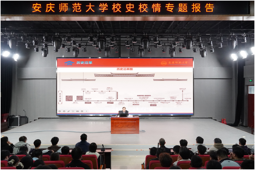 报告中,刘友忠以学校历史发展脉络为经,以校史上重点人、重点事、重点物为纬,详细阐述了我校自敬敷书院以来127年的办学历程及文化积淀,展望了学校办学前景。刘友忠指出,我校作为安徽省高等教育的起源地,历经多次变革,但始终立足地方,面向全国,弘文励教,保持着旺盛的生机和活力。他强调,同学们要传承好红色基因,传播校史文化,努力成长为德智体美劳全面发展的社会主义建设者和接班人。要从校史中汲取明德敏行的养分,树立远大理想和社会担当意识;要从校史中汲取敬敷勤学的养分,积累渊博学识和才能;要从校史中汲取求是创新的养分,培养历史眼光和创新精神;要从校史中涵养校友情怀,增强爱校护校荣校意识。